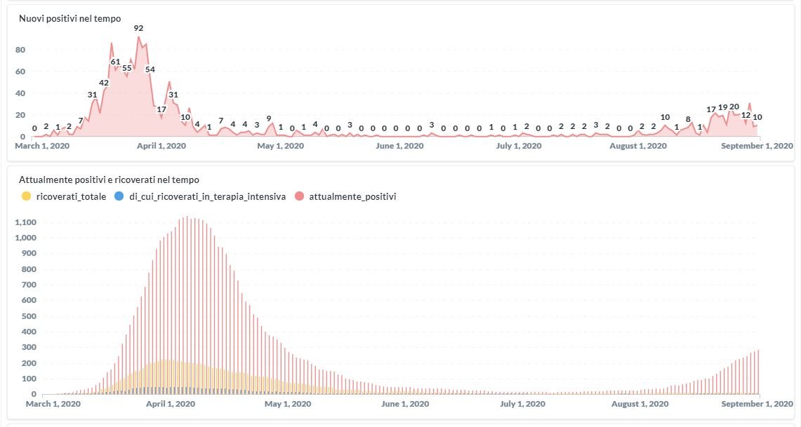 Prosegue il trend in aumento in Umbria del numero dei contagiati da Covid-19. Dai dati aggiornati alle ore 12:38 di oggi 1 settembre, 1803 persone in Umbria risultano in totale positive al virus (+10 rispetto a ieri) , gli attualmente positivi sono 283 (+10 rispetto a ieri), i guariti sono 1440 (uguale rispetto a ieri).