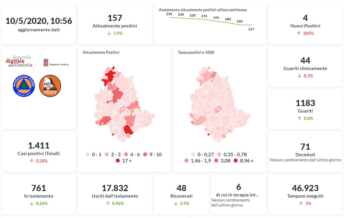 L’Umbria resta tra le regioni con i migliori risultati dal contagiato di Covid-19. Dai dati aggiornati alle ore 10:56 di oggi 10 maggio, 1411 persone in Umbria risultano positive al virus (+4 rispetto a ieri), gli attualmente positivi sono 157 (-3 rispetto a ieri), i guariti sono 1183 (+6 rispetto a ieri).