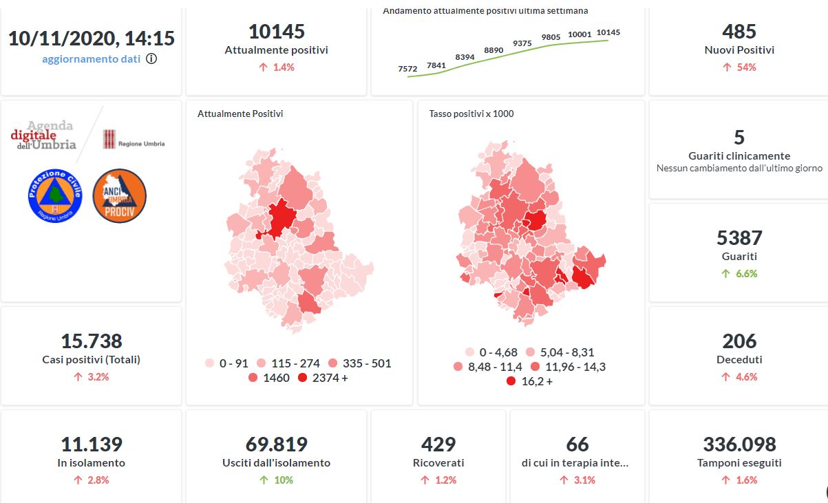 Prosegue il trend in aumento in Umbria del numero dei contagiati da Covid-19. Dai dati aggiornati alle ore 14:15 di oggi 10 novembre, 15.738 persone in Umbria risultano in totale positive al virus (+485 rispetto a ieri) , gli attualmente positivi sono 10.145 (+144 rispetto a ieri), i guariti sono 5.387 (+332 rispetto a ieri).