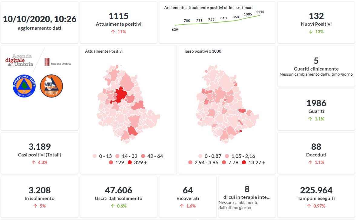 Prosegue il trend in aumento in Umbria del numero dei contagiati da Covid-19. Dai dati aggiornati alle ore 10:26 di oggi 10 ottobre, 3189 persone in Umbria risultano in totale positive al virus (+132 rispetto a ieri) , gli attualmente positivi sono 1115 (+110 rispetto a ieri), i guariti sono 1986 (+21 rispetto a ieri).