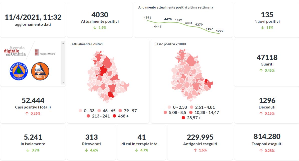 La curva degli attualmente positivi al Covid-19 in Umbria sta lentamente scendendo negli ultimi giorni. Dai dati aggiornati alle ore 11:32 di oggi 11 aprile, 52.444 persone in Umbria risultano in totale positive al virus (+ 135 rispetto a ieri) , gli attualmente positivi sono 4.030 (-77 rispetto a ieri), i guariti sono 467.118 (+210 rispetto a ieri).