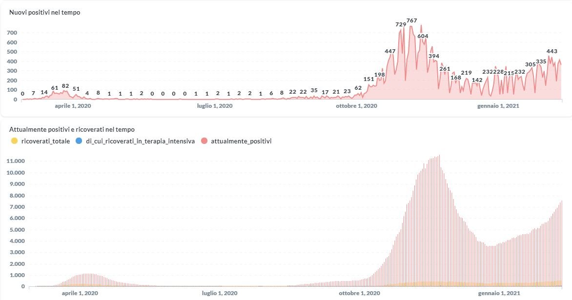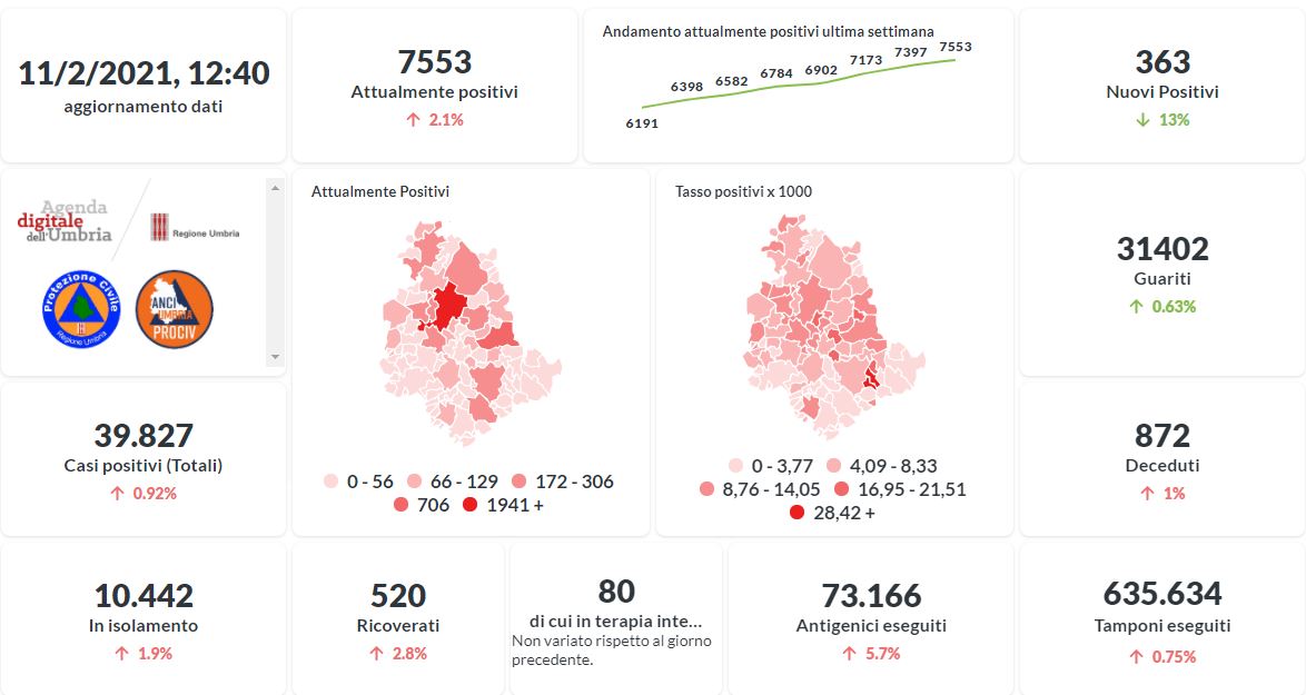 La curva degli attualmente positivi al Covid-19 in Umbria sta lentamente risalendo nelle ultime settimane. Dai dati aggiornati alle ore 12:40 di oggi 11 febbraio, 39.827 persone in Umbria risultano in totale positive al virus (+363 rispetto a ieri) , gli attualmente positivi sono 7.553 (+156 rispetto a ieri), i guariti sono 31.402 (+198 rispetto a ieri).