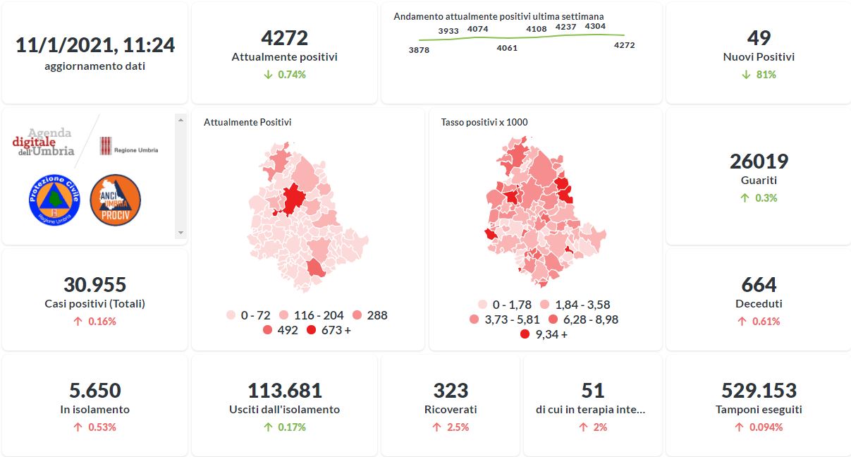 In lieve calo oggi il numero degli attualmente positivi al Covid-19 in Umbria. La curva sta lentamente risalendo nelle ultime settimane. Dai dati aggiornati alle ore 11:24 di oggi 11 gennaio, 30.955 persone in Umbria risultano in totale positive al virus (+49 rispetto a ieri) , gli attualmente positivi sono 4.272 (-32 rispetto a ieri), i guariti sono 26.019 (+77 rispetto a ieri).