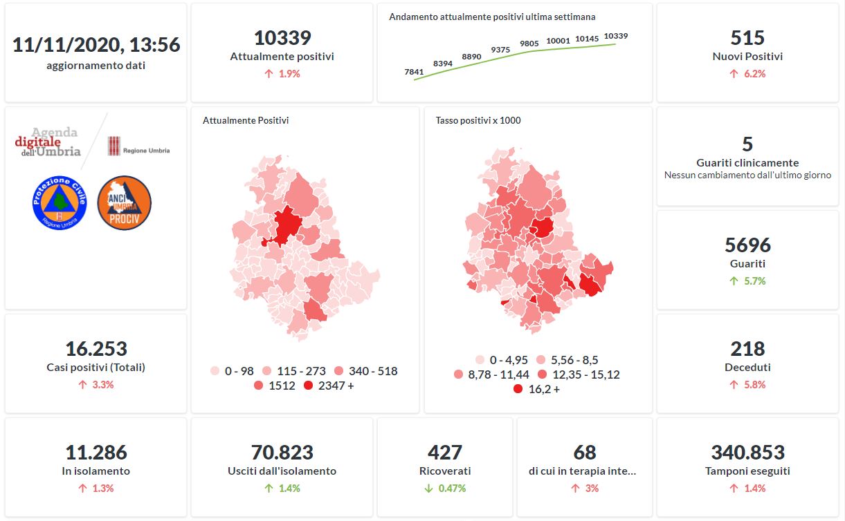 Prosegue il trend in aumento in Umbria del numero dei contagiati da Covid-19. Dai dati aggiornati alle ore 13:56 di oggi 11 novembre, 16.253 persone in Umbria risultano in totale positive al virus (+515 rispetto a ieri) , gli attualmente positivi sono 10.339 (+194 rispetto a ieri), i guariti sono 5.696 (+309 rispetto a ieri).