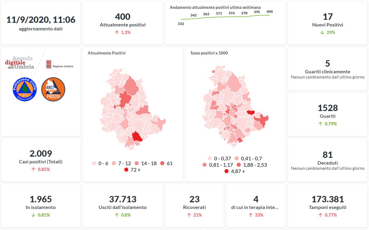 Prosegue il trend in aumento in Umbria del numero dei contagiati da Covid-19. Dai dati aggiornati alle ore 11:06 di oggi 11 settembre, 2009 persone in Umbria risultano in totale positive al virus (+17 rispetto a ieri) , gli attualmente positivi sono 400 (+5 rispetto a ieri), i guariti sono 1528 (+12 rispetto a ieri).