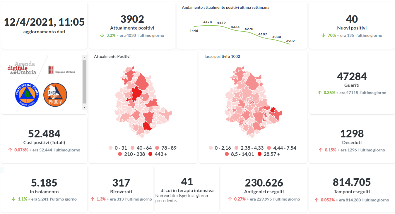 La curva degli attualmente positivi al Covid-19 in Umbria sta lentamente scendendo negli ultimi giorni. Dai dati aggiornati alle ore 11:05 di oggi 12 aprile, 52.484 persone in Umbria risultano in totale positive al virus (+ 40 rispetto a ieri) , gli attualmente positivi sono 3.902 (-128 rispetto a ieri), i guariti sono 47.284 (+166 rispetto a ieri).