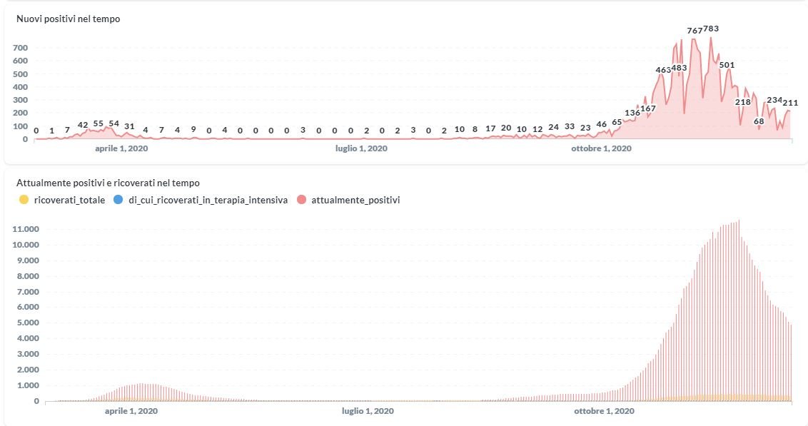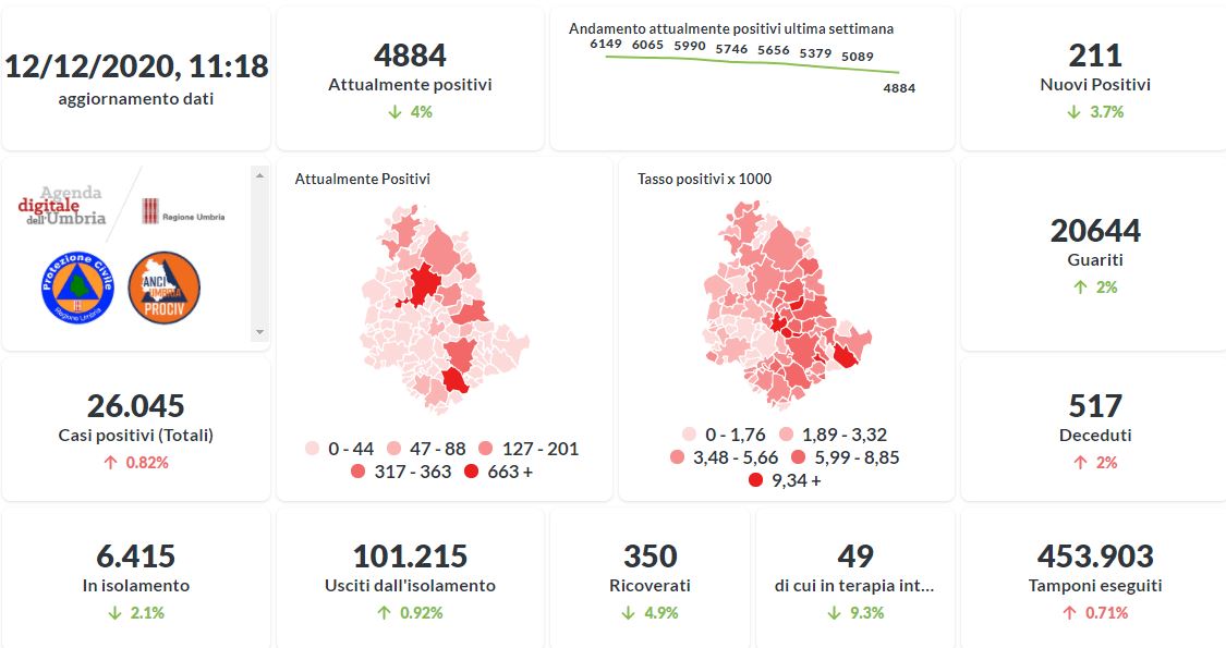 Prosegue il trend in calo in Umbria del numero degli attualmente positivi al Covid-19. Dai dati aggiornati alle ore 11:18 di oggi 12 dicembre, 26.045 persone in Umbria risultano in totale positive al virus (+211 rispetto a ieri) , gli attualmente positivi sono 4.884 (-205 rispetto a ieri), i guariti sono 20.644 (+406 rispetto a ieri).