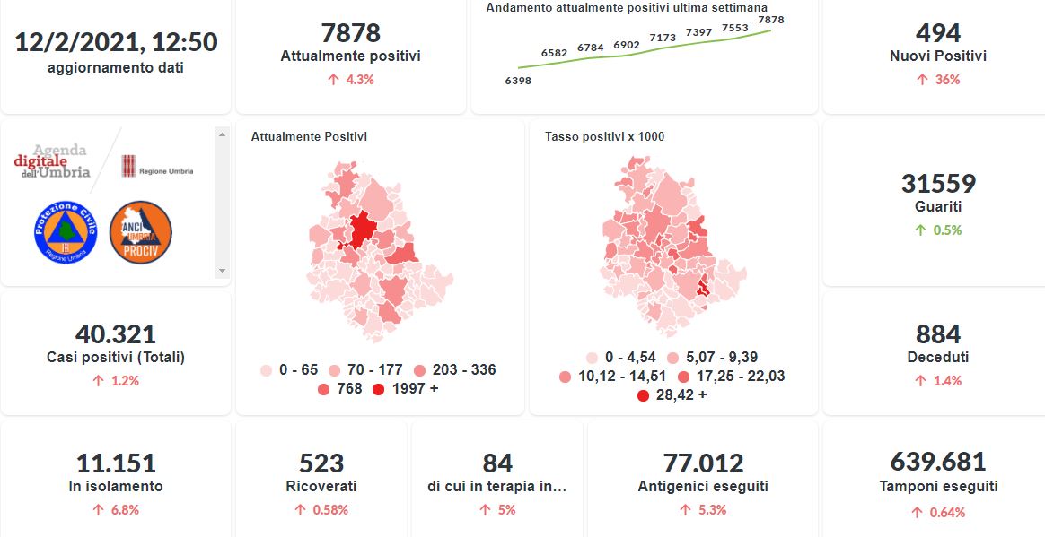 La curva degli attualmente positivi al Covid-19 in Umbria sta lentamente risalendo nelle ultime settimane. Dai dati aggiornati alle ore 12:50 di oggi 12 febbraio, 40.321 persone in Umbria risultano in totale positive al virus (+494 rispetto a ieri) , gli attualmente positivi sono 7.878 (+325 rispetto a ieri), i guariti sono 31.559 (+157 rispetto a ieri).