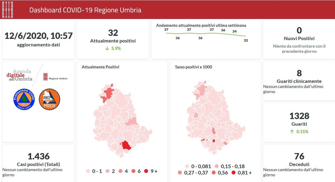 Situazione sempre più stabile in Umbria per l’emergenza Covid-19. Dai dati aggiornati alle ore 10:57 di oggi 12 giugno, 1436 persone in Umbria risultano positive al virus (+0 rispetto a ieri), gli attualmente positivi sono 32 (-2 rispetto a ieri), i guariti sono 1328 (+2 rispetto a ieri).