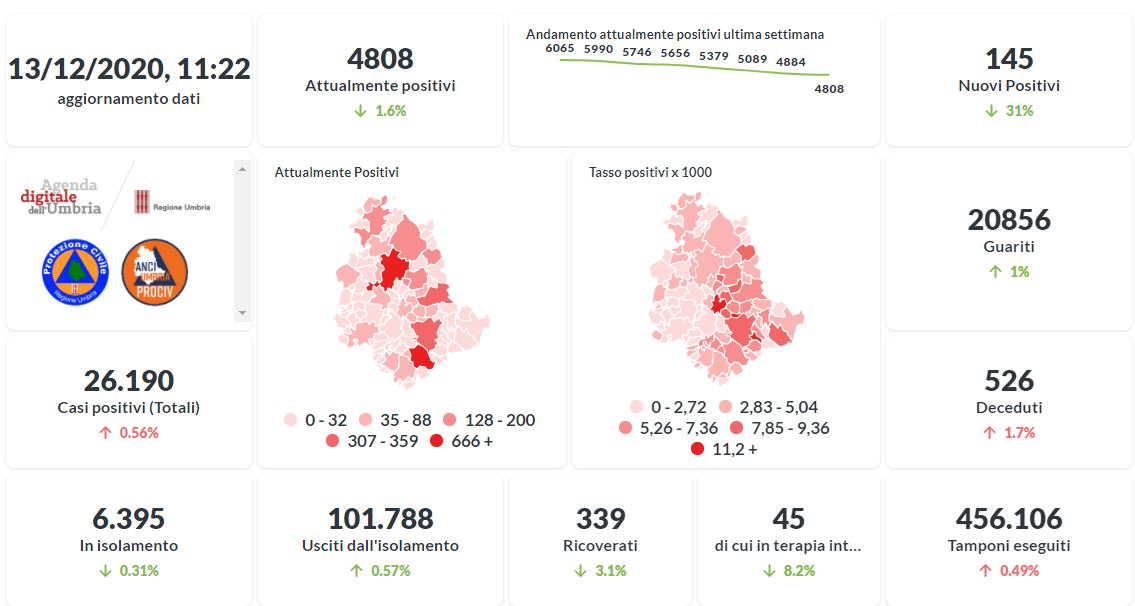 Prosegue il trend in calo in Umbria del numero degli attualmente positivi al Covid-19. Dai dati aggiornati alle ore 11:22 di oggi 13 dicembre, 26.190 persone in Umbria risultano in totale positive al virus (+145 rispetto a ieri) , gli attualmente positivi sono 4.808 (-76 rispetto a ieri), i guariti sono 20.856 (+212 rispetto a ieri).