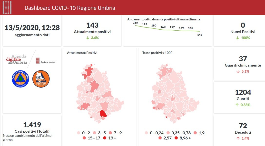 Migliorano ancora in Umbria i contagi da Covid-19. Dai dati aggiornati alle ore 12:28 di oggi 13 maggio, 1419 persone in Umbria risultano positive al virus (+0 rispetto a ieri), gli attualmente positivi sono 143 (-5 rispetto a ieri), i guariti sono 1204 (+4 rispetto a ieri).
