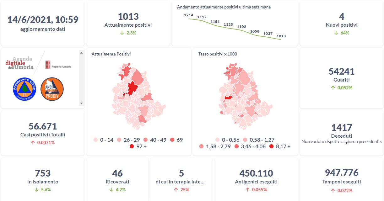 La curva degli attualmente positivi al Covid-19 in Umbria sta lentamente scendendo nelle ultime settimane. Dai dati aggiornati alle ore 10:59 di oggi 14 giugno, 56.671 persone in Umbria risultano in totale positive al virus (+ 4 rispetto a ieri) , gli attualmente positivi sono 1.013 (-24 rispetto a ieri), i guariti sono 54.241 (+28 rispetto a ieri).