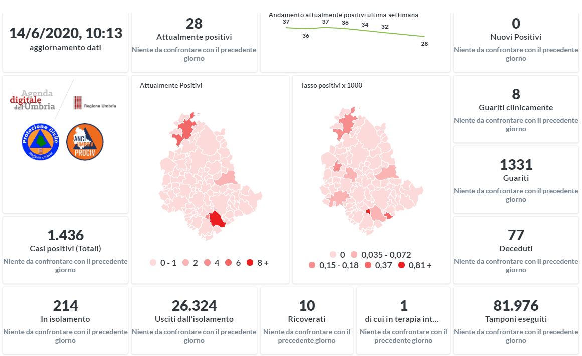 Situazione sempre più stabile in Umbria per l’emergenza Covid-19. Dai dati aggiornati alle ore 10:13 di oggi 14 giugno, 1436 persone in Umbria risultano positive al virus (+0 rispetto a ieri), gli attualmente positivi sono 28 (-4 rispetto a ieri), i guariti sono 1331 (+4 rispetto a ieri).