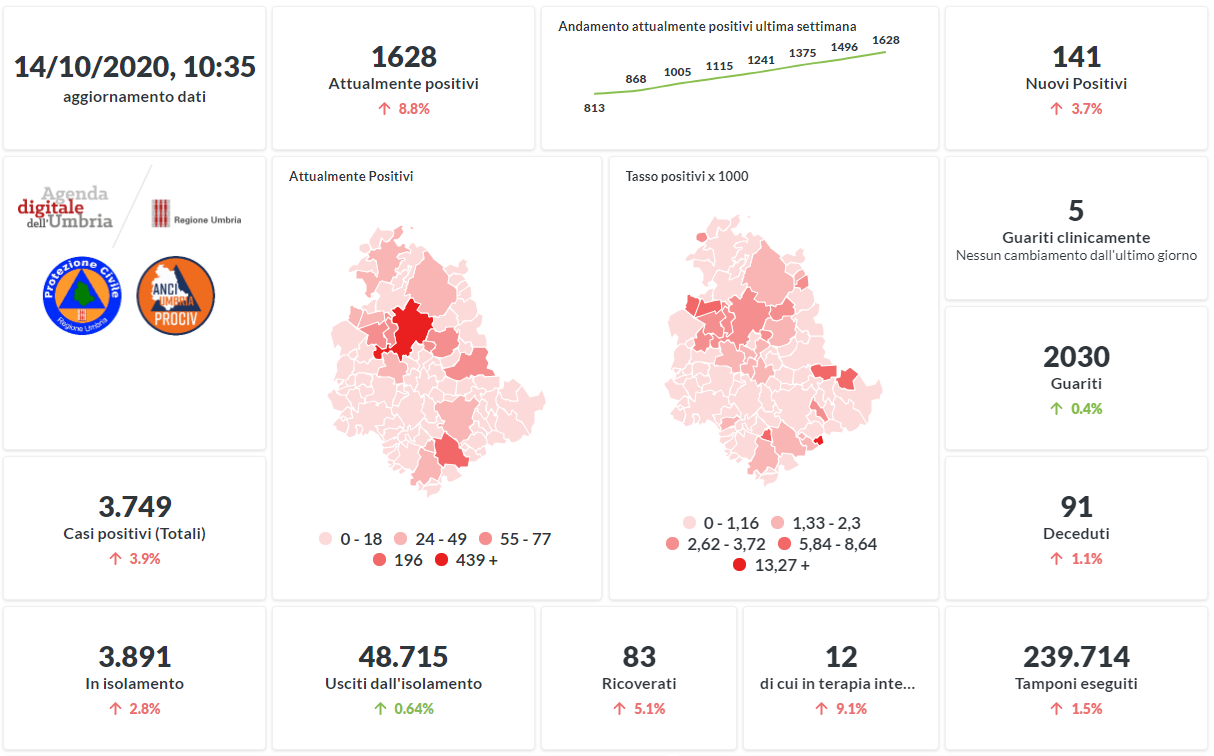 Prosegue il trend in aumento in Umbria del numero dei contagiati da Covid-19. Dai dati aggiornati alle ore 10:35 di oggi 14 ottobre, 3749 persone in Umbria risultano in totale positive al virus (+141 rispetto a ieri) , gli attualmente positivi sono 1628 (+132 rispetto a ieri), i guariti sono 2030 (+8 rispetto a ieri).
