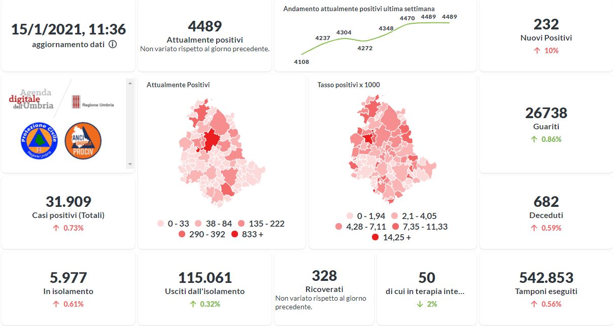 Invariato oggi il numero degli attualmente positivi al Covid-19 in Umbria. La curva sta lentamente risalendo nelle ultime settimane. Dai dati aggiornati alle ore 11:36 di oggi 15 gennaio, 31.909 persone in Umbria risultano in totale positive al virus (+232 rispetto a ieri) , gli attualmente positivi sono 4.489 (uguale rispetto a ieri), i guariti sono 26.730 (+228 rispetto a ieri).