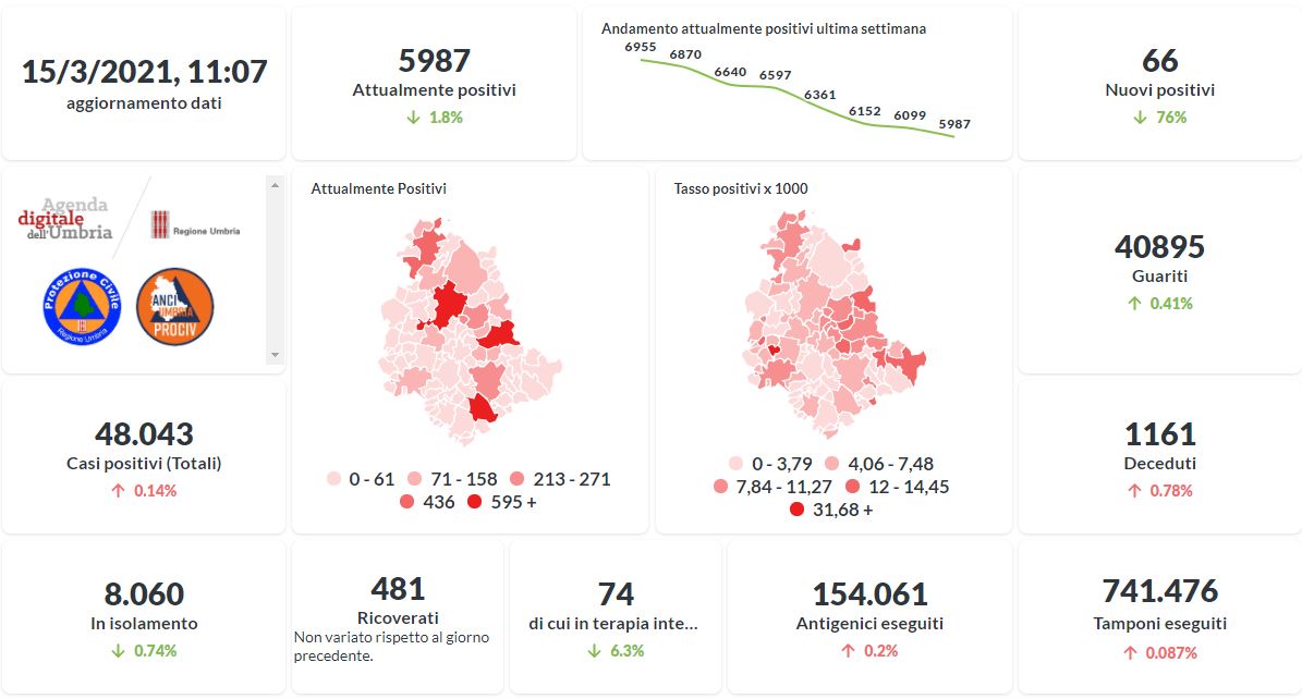 La curva degli attualmente positivi al Covid-19 in Umbria sta lentamente scendendo negli ultimi giorni. Dai dati aggiornati alle ore 11:07 di oggi 15 marzo, 48.043 persone in Umbria risultano in totale positive al virus (+ 66 rispetto a ieri) , gli attualmente positivi sono 5.987 (-112 rispetto a ieri), i guariti sono 40.895 (+169 rispetto a ieri).