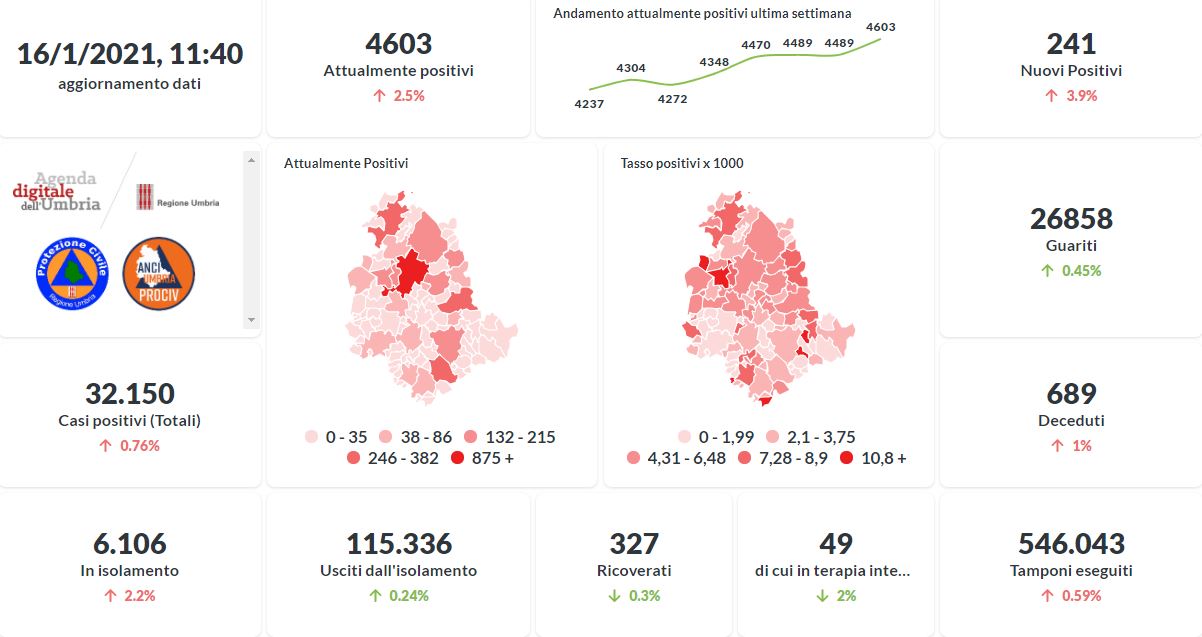 In aumento oggi il numero degli attualmente positivi al Covid-19 in Umbria. La curva sta lentamente risalendo nelle ultime settimane. Dai dati aggiornati alle ore 11:40 di oggi 16 gennaio, 32.150 persone in Umbria risultano in totale positive al virus (+241 rispetto a ieri) , gli attualmente positivi sono 4.603 (+114 rispetto a ieri), i guariti sono 26.858 (+128 rispetto a ieri).