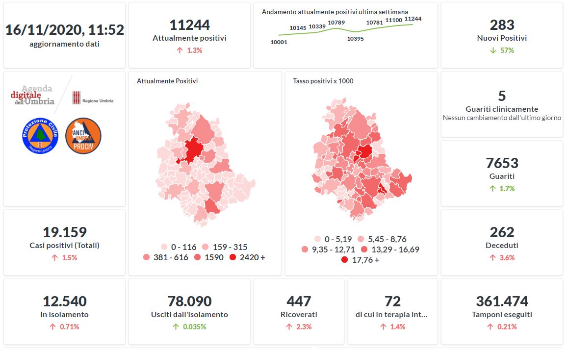 Prosegue il trend in aumento in Umbria del numero dei contagiati da Covid-19. Dai dati aggiornati alle ore 11:52 di oggi 16 novembre, 19.159 persone in Umbria risultano in totale positive al virus (+283 rispetto a ieri) , gli attualmente positivi sono 11.244 (+144 rispetto a ieri), i guariti sono 7.653 (+130 rispetto a ieri).