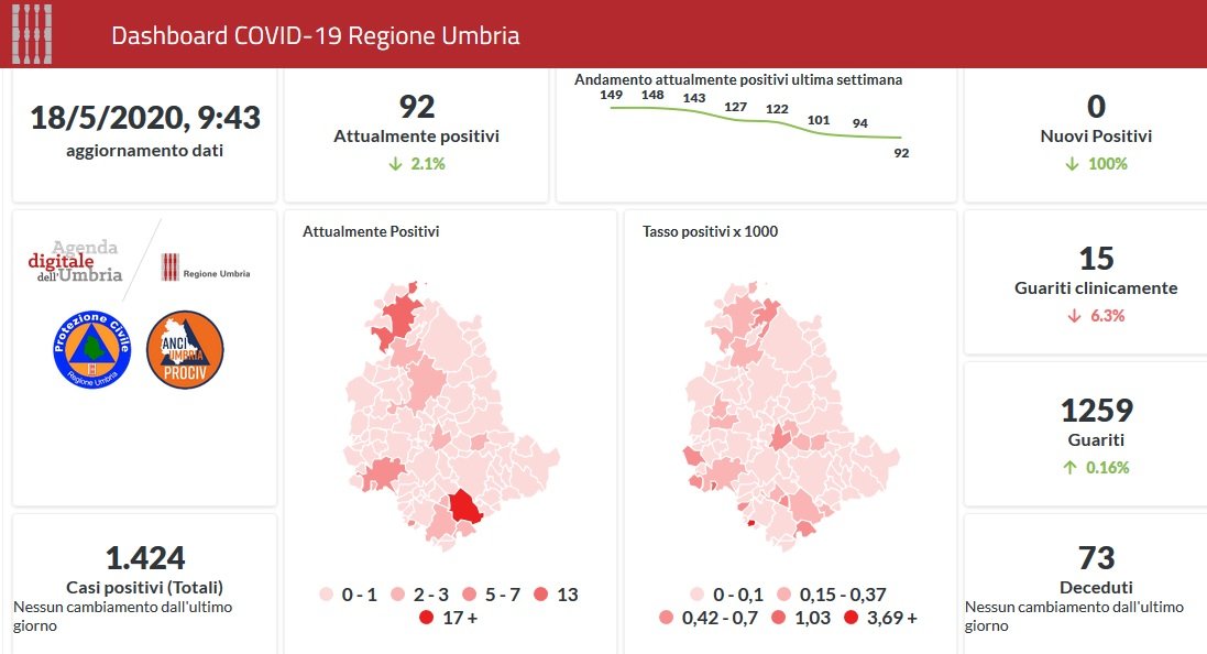 Notizie ancora confortanti in Umbria per i contagi da Covid-19. Dai dati aggiornati alle ore 09:43 di oggi 18 maggio, 1424 persone in Umbria risultano positive al virus (+0 rispetto a ieri), gli attualmente positivi sono 92 (-2 rispetto a ieri), i guariti sono 1259 (+2 rispetto a ieri).
