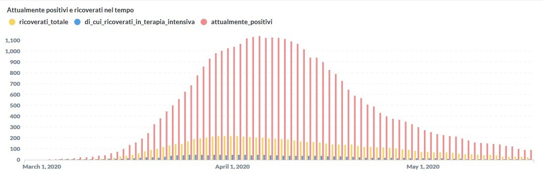 Sono ricoverati in 26 di cui 2 (invariato rispetto a ieri) in terapia intensiva. Al momento le persone in isolamento domiciliare sono 577 (-29 rispetto a ieri) in totale e 20.111 (+79) quelle uscite dall’isolamento.