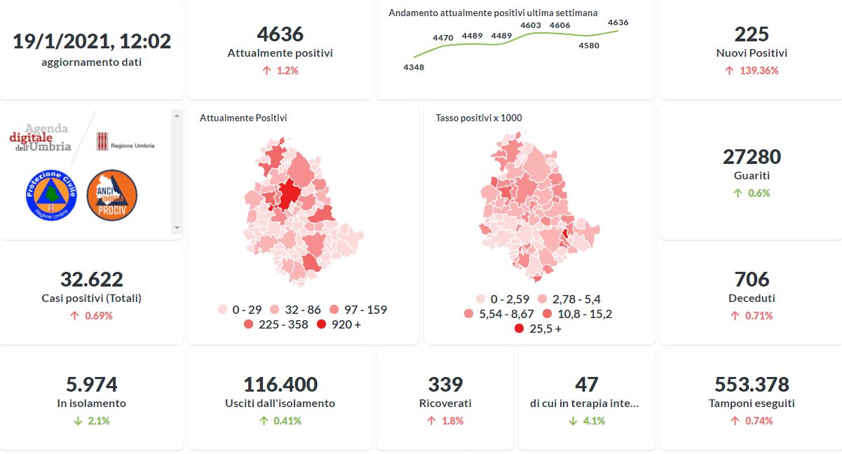 In lieve aumento oggi il numero degli attualmente positivi al Covid-19 in Umbria. La curva sta lentamente risalendo nelle ultime settimane. Dai dati aggiornati alle ore 12:02 di oggi 19 gennaio, 32.622 persone in Umbria risultano in totale positive al virus (+225 rispetto a ieri) , gli attualmente positivi sono 4.636 (+56 rispetto a ieri), i guariti sono 27.280 (+164 rispetto a ieri).