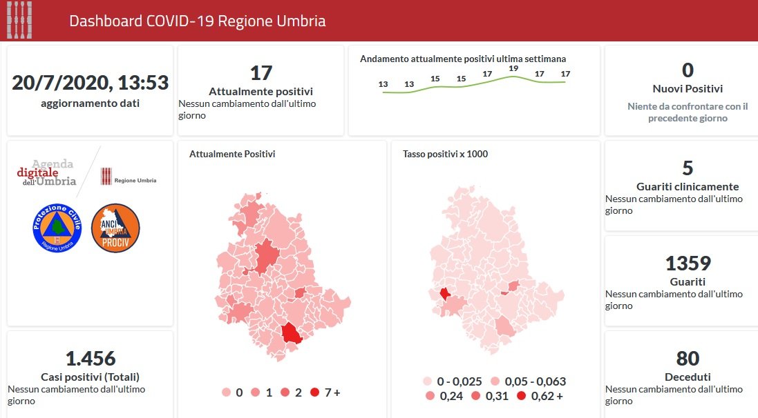 Situazione stabile in Umbria da Covid-19. Dai dati aggiornati alle ore 13:53 di oggi 20 luglio, 1456 persone in Umbria risultano in totale positive al virus (uguale rispetto a ieri), gli attualmente positivi sono 17 (uguale rispetto a ieri), i guariti sono 1359 (uguale rispetto a ieri).