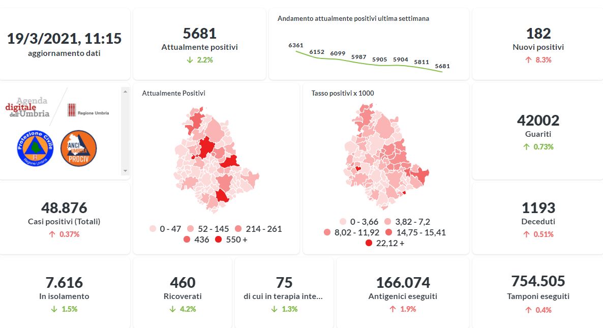 La curva degli attualmente positivi al Covid-19 in Umbria sta lentamente scendendo negli ultimi giorni. Dai dati aggiornati alle ore 11:15 di oggi 19 marzo, 48.876 persone in Umbria risultano in totale positive al virus (+ 182 rispetto a ieri) , gli attualmente positivi sono 5.681 (-130 rispetto a ieri), i guariti sono 42.002 (+306 rispetto a ieri).