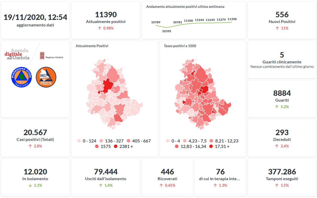 Prosegue il trend in aumento in Umbria del numero dei contagiati da Covid-19. Dai dati aggiornati alle ore 12:54 di oggi 19 novembre, 20.567 persone in Umbria risultano in totale positive al virus (+556 rispetto a ieri) , gli attualmente positivi sono 11.390 (+111 rispetto a ieri), i guariti sono 8.884 (+438 rispetto a ieri).