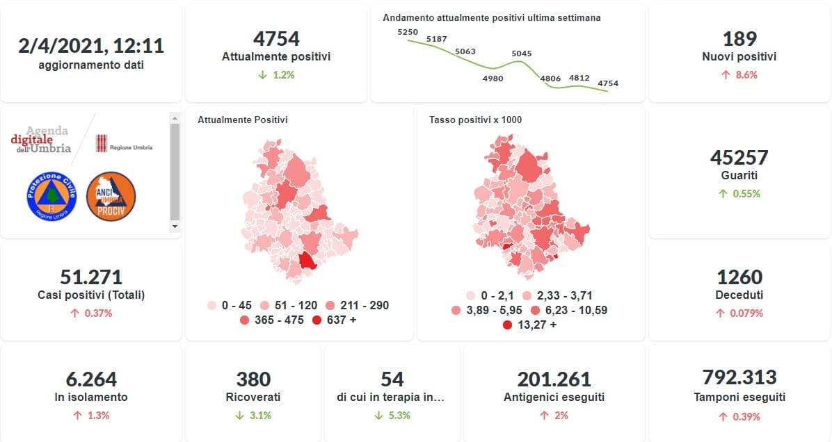 La curva degli attualmente positivi al Covid-19 in Umbria sta lentamente scendendo negli ultimi giorni. Dai dati aggiornati alle ore 12:11 di oggi 2 aprile, 51.271 persone in Umbria risultano in totale positive al virus (+ 189 rispetto a ieri) , gli attualmente positivi sono 4.754 (-58 rispetto a ieri), i guariti sono 45.257 (+246 rispetto a ieri).