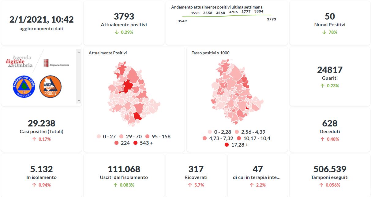 Coronavirus, i dati aggiornati al 2 gennaio della Regione Umbria.