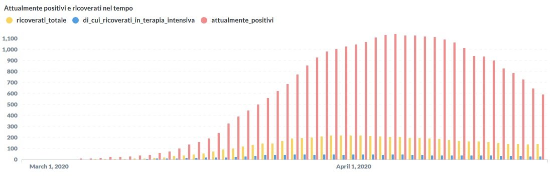 Sono ricoverati in 142  di cui 29 (-1 rispetto a ieri) sono in terapia intensiva. Al momento le persone in isolamento domiciliare sono 1375 (-96 rispetto a ieri) in totale e 11.793 (+176) quelle uscite dall’isolamento.
