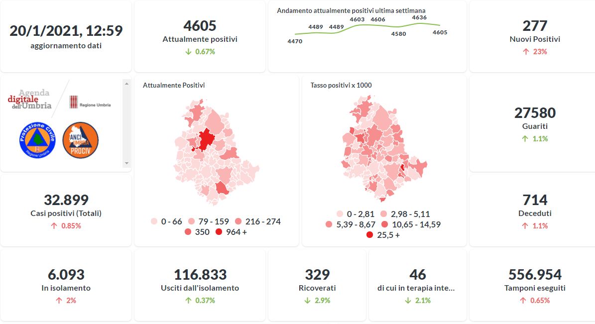 In lieve calo oggi il numero degli attualmente positivi al Covid-19 in Umbria. La curva sta lentamente risalendo nelle ultime settimane. Dai dati aggiornati alle ore 12:59 di oggi 20 gennaio, 32.899 persone in Umbria risultano in totale positive al virus (+277 rispetto a ieri) , gli attualmente positivi sono 4.605 (-31   rispetto a ieri), i guariti sono 27.580 (+300 rispetto a ieri).