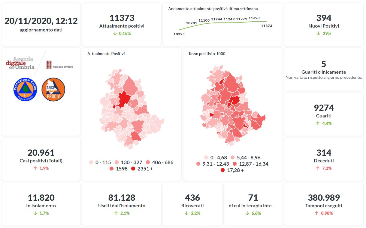 Prosegue il trend in aumento in Umbria del numero dei contagiati da Covid-19. Dai dati aggiornati alle ore 12:12 di oggi 20 novembre, 20.961 persone in Umbria risultano in totale positive al virus (+394 rispetto a ieri) , gli attualmente positivi sono 11.373 (-17 rispetto a ieri), i guariti sono 9.274 (+390 rispetto a ieri).