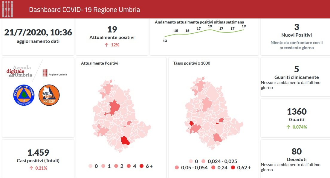 Lieve aumento di positivi in Umbria da Covid-19. Dai dati aggiornati alle ore 10:36 di oggi 21 luglio, 1459 persone in Umbria risultano in totale positive al virus (+3 rispetto a ieri), gli attualmente positivi sono 19 (+2 rispetto a ieri), i guariti sono 1360 (+1 rispetto a ieri).