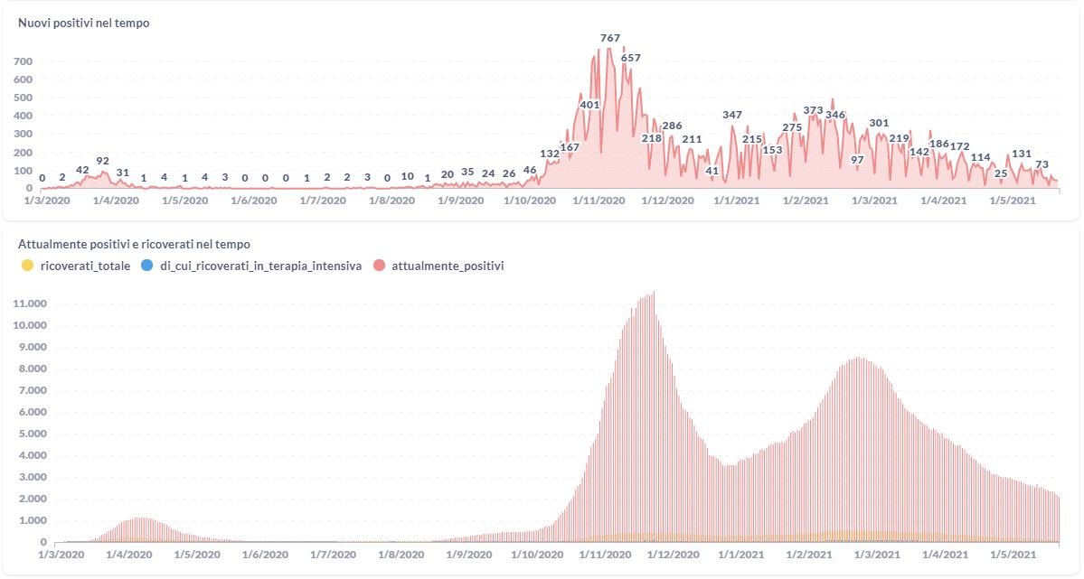 La curva degli attualmente positivi al Covid-19 in Umbria sta lentamente scendendo nelle ultime settimane. Dai dati aggiornati alle ore 11:17 di oggi 21 maggio, 56.025 persone in Umbria risultano in totale positive al virus (+ 45 rispetto a ieri) , gli attualmente positivi sono 2.097 (-97 rispetto a ieri), i guariti sono 52.542 (+139 rispetto a ieri).