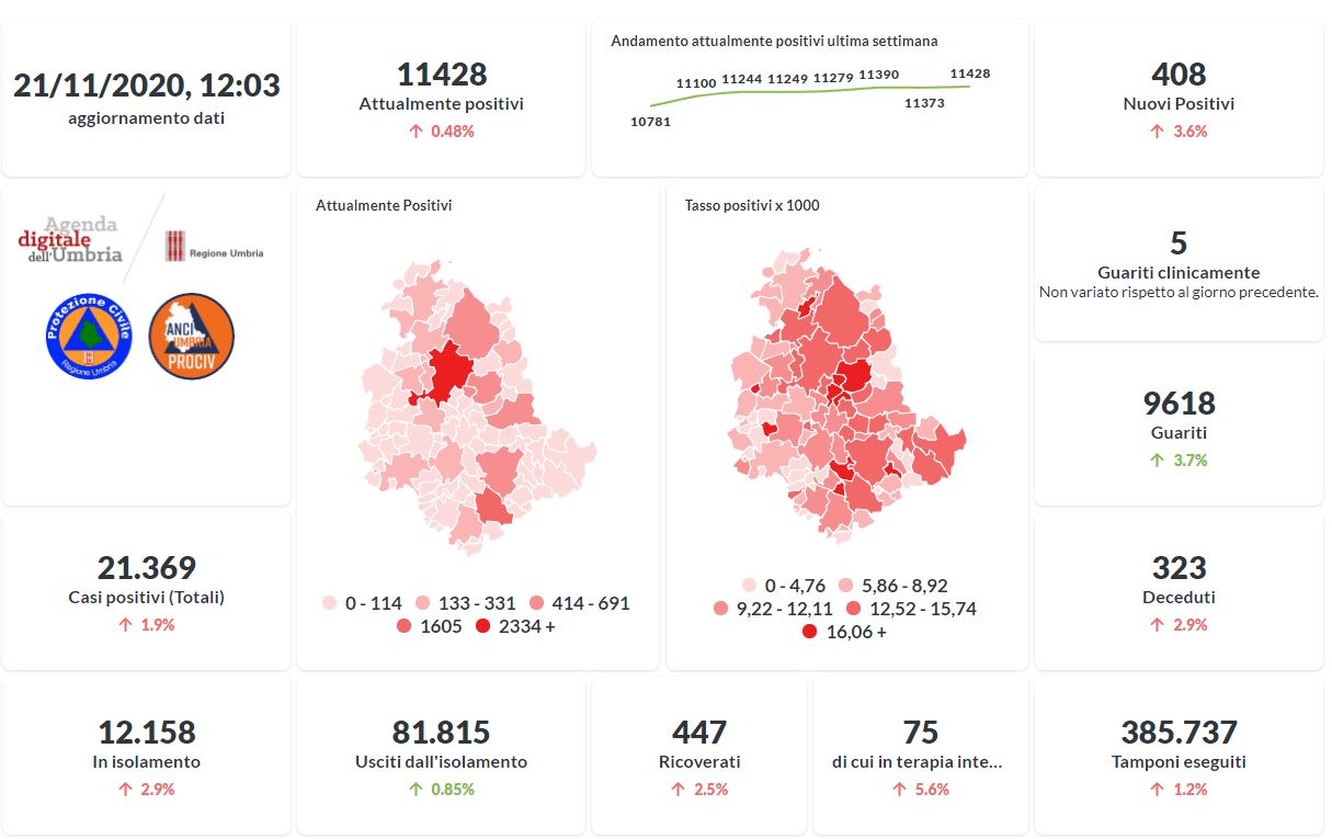 Prosegue il trend in aumento in Umbria del numero dei contagiati da Covid-19. Dai dati aggiornati alle ore 12:30 di oggi 21 novembre, 21.369 persone in Umbria risultano in totale positive al virus (+408 rispetto a ieri) , gli attualmente positivi sono 11.428 (+55 rispetto a ieri), i guariti sono 9.618 (+344 rispetto a ieri).