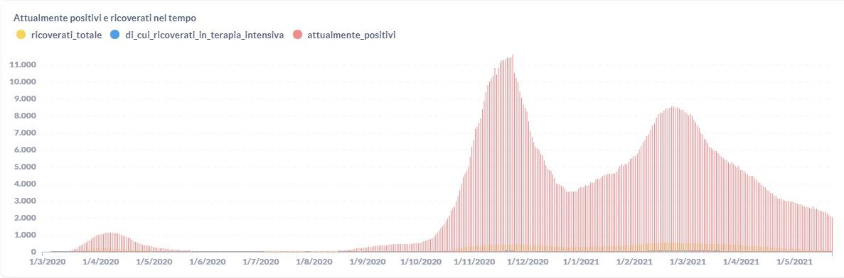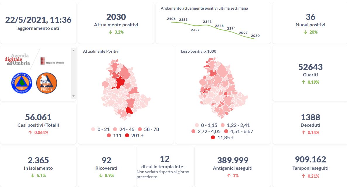 La curva degli attualmente positivi al Covid-19 in Umbria sta lentamente scendendo nelle ultime settimane. Dai dati aggiornati alle ore 11:36 di oggi 22 maggio, 56.061 persone in Umbria risultano in totale positive al virus (+ 36 rispetto a ieri) , gli attualmente positivi sono 2.030 (-67 rispetto a ieri), i guariti sono 52.643 (+101 rispetto a ieri).