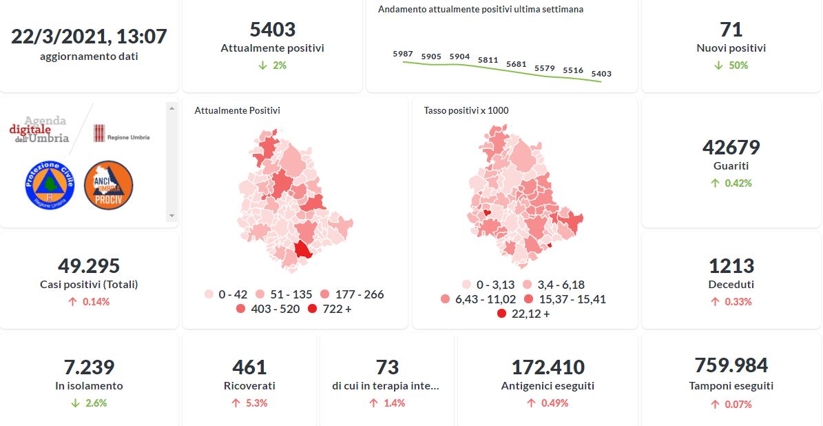 La curva degli attualmente positivi al Covid-19 in Umbria sta lentamente scendendo negli ultimi giorni. Dai dati aggiornati alle ore 13:03 di oggi 22 marzo, 49.295 persone in Umbria risultano in totale positive al virus (+ 71 rispetto a ieri) , gli attualmente positivi sono 5.403 (-113 rispetto a ieri), i guariti sono 42.679 (+180 rispetto a ieri).