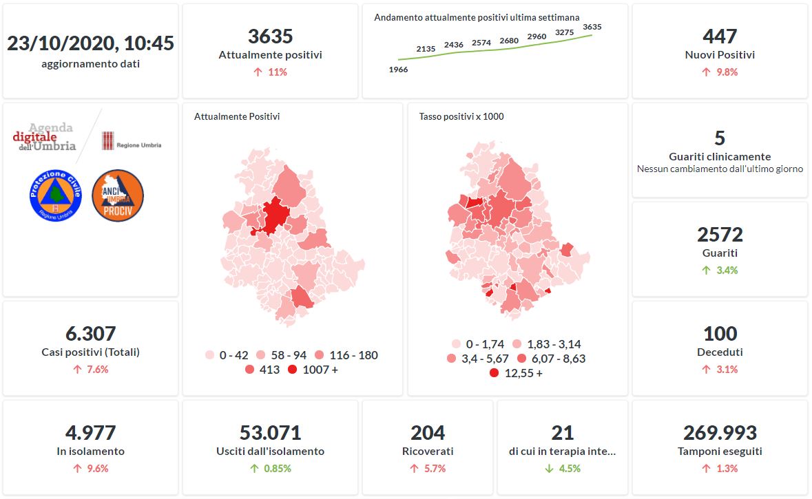 Prosegue il trend in aumento in Umbria del numero dei contagiati da Covid-19. Dai dati aggiornati alle ore 10:45 di oggi 23 ottobre, 6307 persone in Umbria risultano in totale positive al virus (+447 rispetto a ieri) , gli attualmente positivi sono 3635 (+360 rispetto a ieri), i guariti sono 2572 (+84 rispetto a ieri).