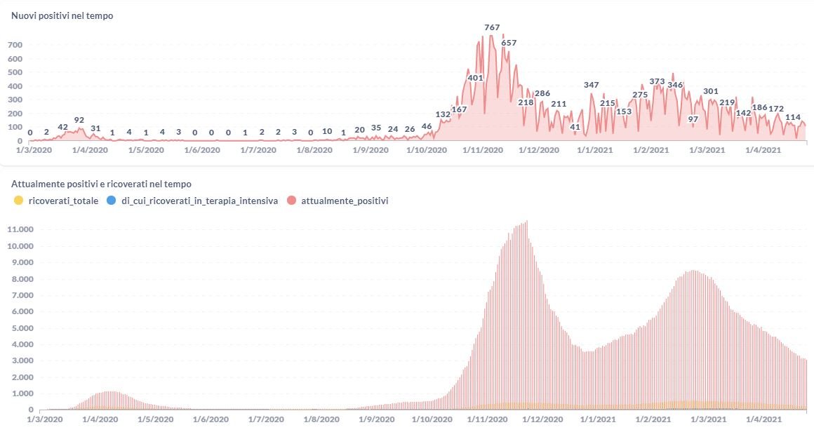 La curva degli attualmente positivi al Covid-19 in Umbria sta lentamente scendendo negli ultimi giorni. Dai dati aggiornati alle ore 10:37 di oggi 24 aprile, 53.810 persone in Umbria risultano in totale positive al virus (+ 105 rispetto a ieri) , gli attualmente positivi sono 3.066 (-57 rispetto a ieri), i guariti sono 49.405 (+159 rispetto a ieri).