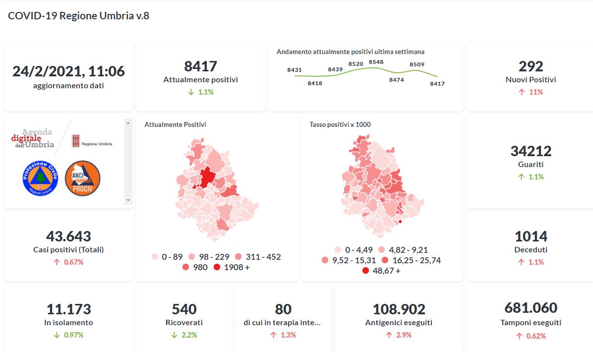 La curva degli attualmente positivi al Covid-19 in Umbria sta lentamente risalendo nelle ultime settimane, sembra in questi ultimi giorni si stia stabilizzando. Dai dati aggiornati alle ore 11:06 di oggi 24 febbraio, 43.643 persone in Umbria risultano in totale positive al virus (+292 rispetto a ieri) , gli attualmente positivi sono 8.417 (-92 rispetto a ieri), i guariti sono 34.212 (+373 rispetto a ieri).