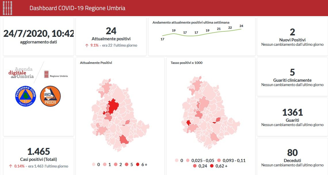 Anche oggi un piccolo aumento di positivi in Umbria da Covid-19. Dai dati aggiornati alle ore 10:42 di oggi 24 luglio, 1465 persone in Umbria risultano in totale positive al virus (+2 rispetto a ieri), gli attualmente positivi sono 24 (+2 rispetto a ieri), i guariti sono 1361 (uguale rispetto a ieri).