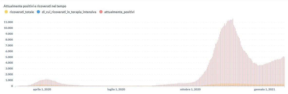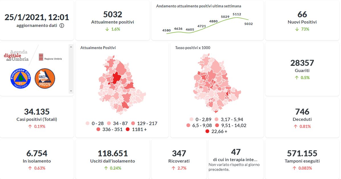 In lieve calo oggi il numero degli attualmente positivi al Covid-19 in Umbria. La curva sta lentamente risalendo nelle ultime settimane. Dai dati aggiornati alle ore 12:01 di oggi 25 gennaio, 34.135 persone in Umbria risultano in totale positive al virus (+66 rispetto a ieri) , gli attualmente positivi sono 5.032 (-80 rispetto a ieri), i guariti sono 28.357 (+140 rispetto a ieri).