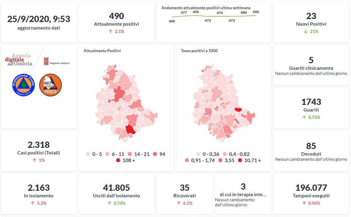 Prosegue il trend in aumento in Umbria del numero dei contagiati da Covid-19. Dai dati aggiornati alle ore 09:53 di oggi 24 settembre, 2318 persone in Umbria risultano in totale positive al virus (+23 rispetto a ieri) , gli attualmente positivi sono 490 (+10 rispetto a ieri), i guariti sono 1743 (+13 rispetto a ieri).