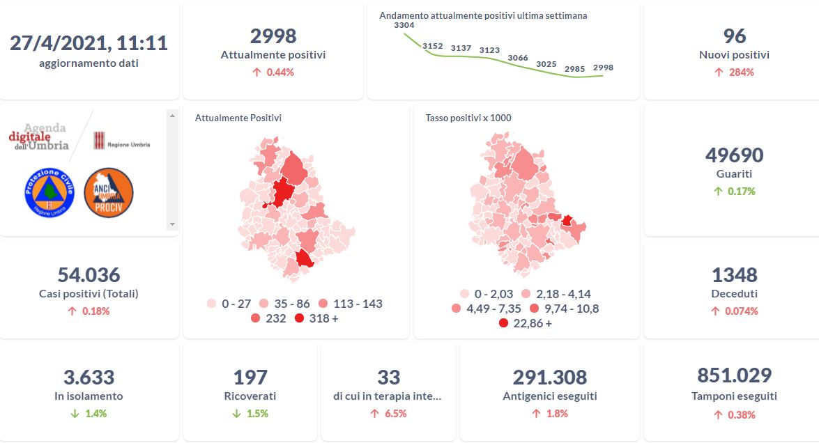 Coronavirus, i dati aggiornati al 27 aprile della Regione Umbria.
