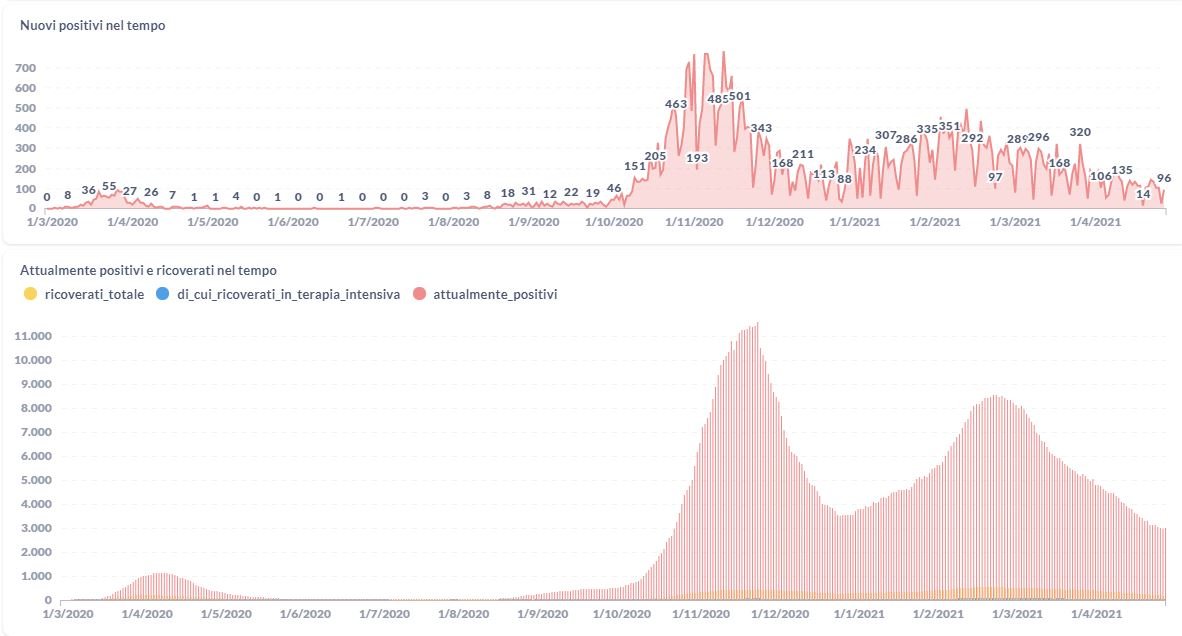 La curva degli attualmente positivi al Covid-19 in Umbria sta lentamente scendendo negli ultimi giorni. Dai dati aggiornati alle ore 11:11 di oggi 27 aprile, 54.036 persone in Umbria risultano in totale positive al virus (+ 96 rispetto a ieri) , gli attualmente positivi sono 2.998 (+13 rispetto a ieri), i guariti sono 49.690 (+85 rispetto a ieri).