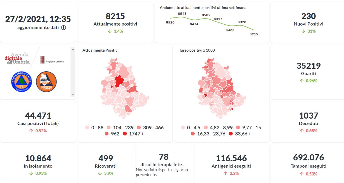 La curva degli attualmente positivi al Covid-19 in Umbria sta lentamente risalendo nelle ultime settimane, sembra in questi ultimi giorni si stia stabilizzando. Dai dati aggiornati alle ore 12:35 di oggi 27 febbraio, 44.471 persone in Umbria risultano in totale positive al virus (+230 rispetto a ieri) , gli attualmente positivi sono 8.215 (-113 rispetto a ieri), i guariti sono 35.219 (+336 rispetto a ieri).