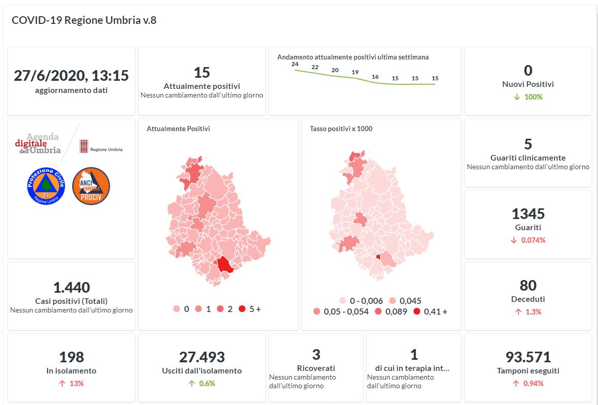Stabile in Umbria la situazione Covid-19. Dai dati aggiornati alle ore 13:15 di oggi 27 giugno, 1440 persone in Umbria risultano in totale positive al virus (+1 rispetto a ieri), gli attualmente positivi sono 15 (uguale rispetto a ieri), i guariti sono 1345 (-1 rispetto a ieri).