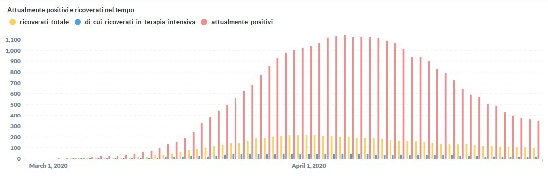 Sono ricoverati in 97 di cui 17 (+1 rispetto a ieri) sono in terapia intensiva. Al momento le persone in isolamento domiciliare sono 981 (+4 rispetto a ieri) in totale e 14.594 (+494) quelle uscite dall’isolamento.