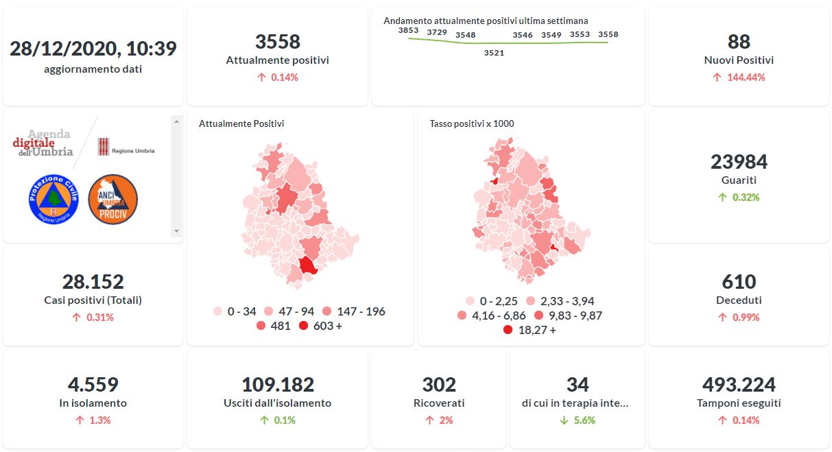 Lieve aumento del numero degli attualmente positivi al Covid-19 in Umbria . Dai dati aggiornati alle ore 10:39 di oggi 28 dicembre, 28.152 persone in Umbria risultano in totale positive al virus (+88 rispetto a ieri) , gli attualmente positivi sono 3.558 (+5 rispetto a ieri), i guariti sono 23.984 (+77 rispetto a ieri).